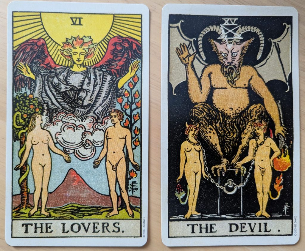 The Lovers are lit by a big, burning sun. They can see everything around them. They have the power to sculpt. These same figures find themselves in a different situation with The Devil, however. They are in complete and total darkness. The Devil, in fact, actively hides away the only light there is. He doesn’t invite the lovers to stay with him, but instead forces them into bondage with chains. On one card, their nakedness is beautiful and pure. On another it is degrading and embarrassing.