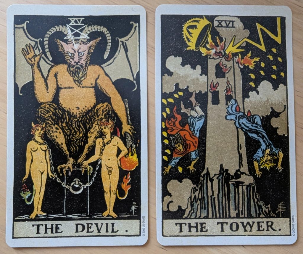The Devil (tarot key #15) is a divisive card. A terrifying and hulking monster holds in bondage a naked man and woman. They are surrounded in darkness. This is followed by tarot key #16, The Tower. Lightening strikes a tower in the dead of night, and the golden crown which sits atop falls to the ground.